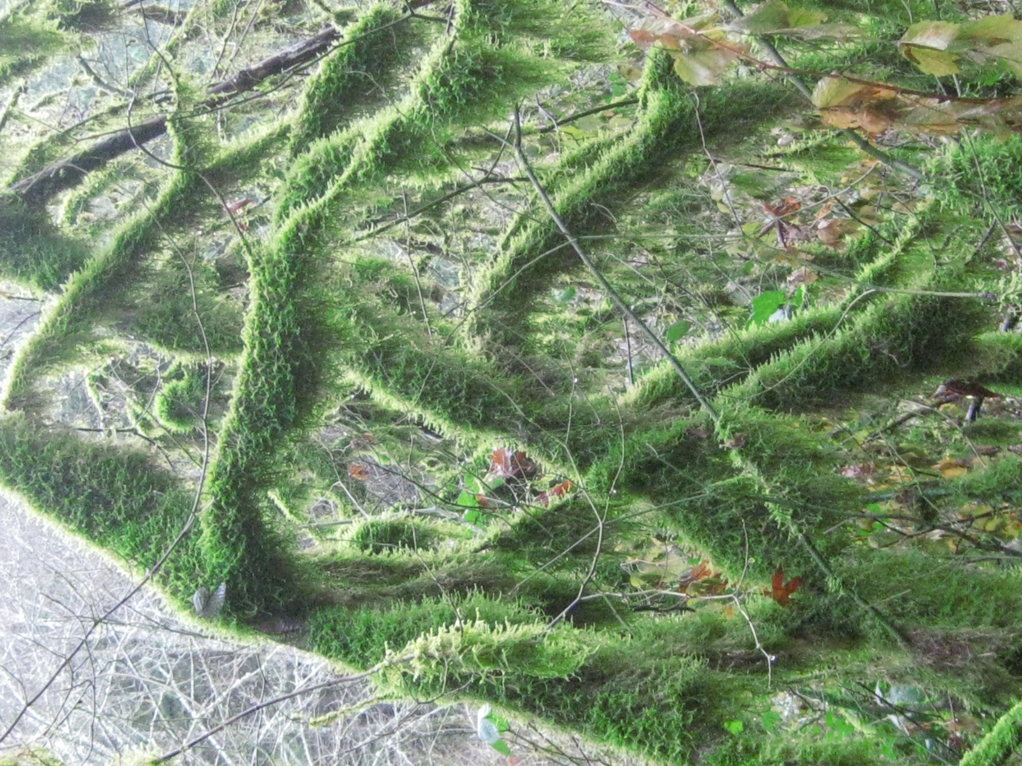 Better start jogging. Rocks force our ankles to work, which we always love. Our pace quickens downhill, and before us, a carpet of green, spread out for us to jog upon. The trail curves clockwise and takes us deeper into a Technicolor jungle. But there’s only one color: blanched asparagus green. It shrouds limbs and rocks. It’s hair-like, and we stop for a minute to run our fingers through its damp fur. You want to exfoliate with it, if only it was sterilized.