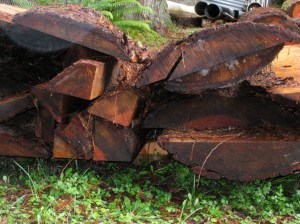 This year I am determined to have raised beds. I set a date. I enlisted my handyman. I checked the weather. I scoured Skagit Building Salvage, where a hearty supply of used lumber begged for a new life. Through a work contact, N found some–what shall I call these pieces, nay, chunks of tree?–mother effing huge slabs of trees. The Forest Service had felled and processed the heart of the trees for table tops and benches; the remaining sides were up for grabs. N told me about the quarter-ish rounds, bark on one side, flush-cut on the other. They sounded cool enough.