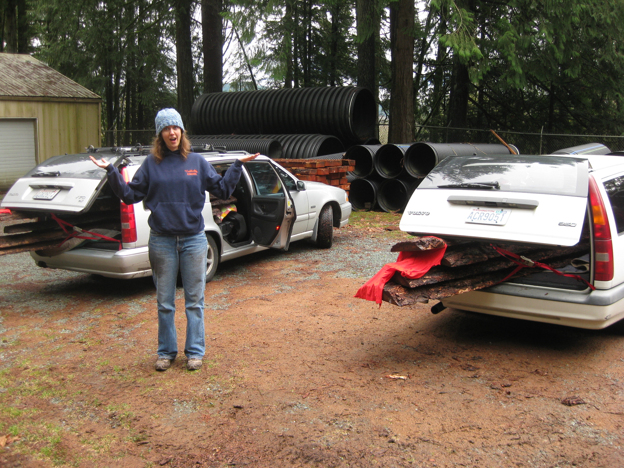 Have I mentioned we drive Volvo wagons? Yes, you imagined correctly: one silver Volvo trudging a 6,000 lbs. forklift out of the quagmire. It was symbolic, I think.