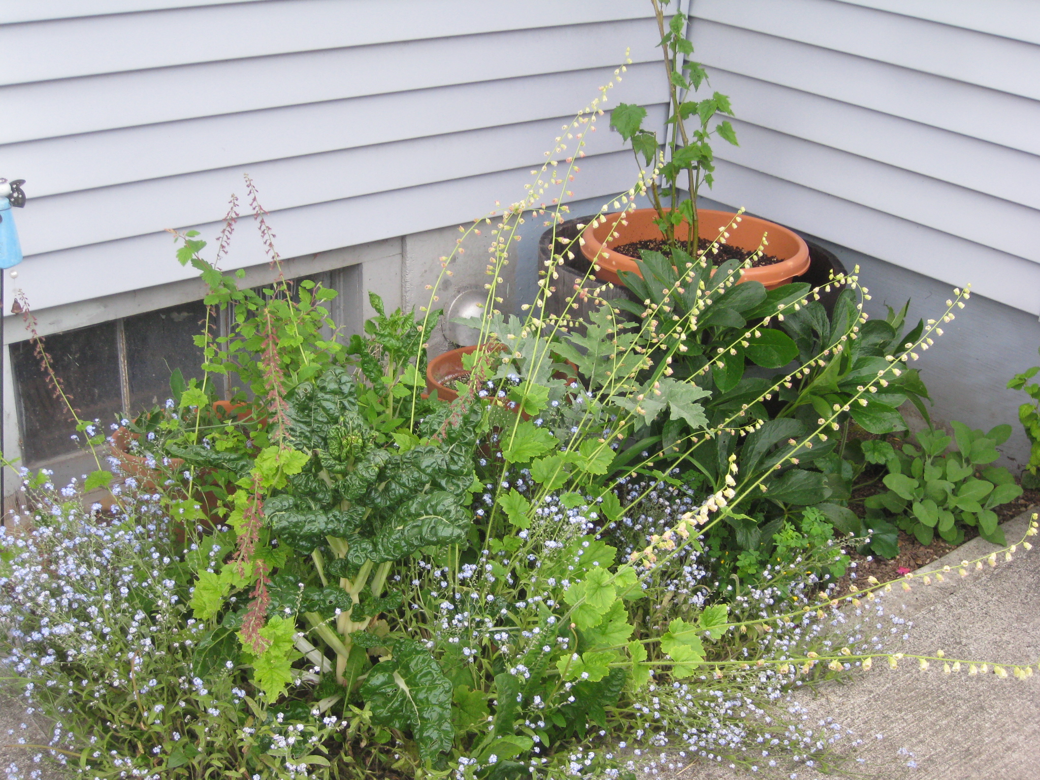 It’s funny how much joy a little bit of green brings to my life. I swear, somehow I am not a slave to all this. I weed (I don’t even know if I can call it that) once a month, and that’s with a beer in one hand. I water only when it’s hot for several days in a row, and my biggest challenge is harvesting the stuff before it goes to seed. Case in point: this little spot used to house a behemoth sized oil tank. In just two years, its rich with life: forget-me-nots, swiss chard, sage, hellebores and some other donated native stuff. Is it Sunset Magazine worthy? Not by a long shot. But it does make me smile. It flavors my dinner. It provides flowers for my home.