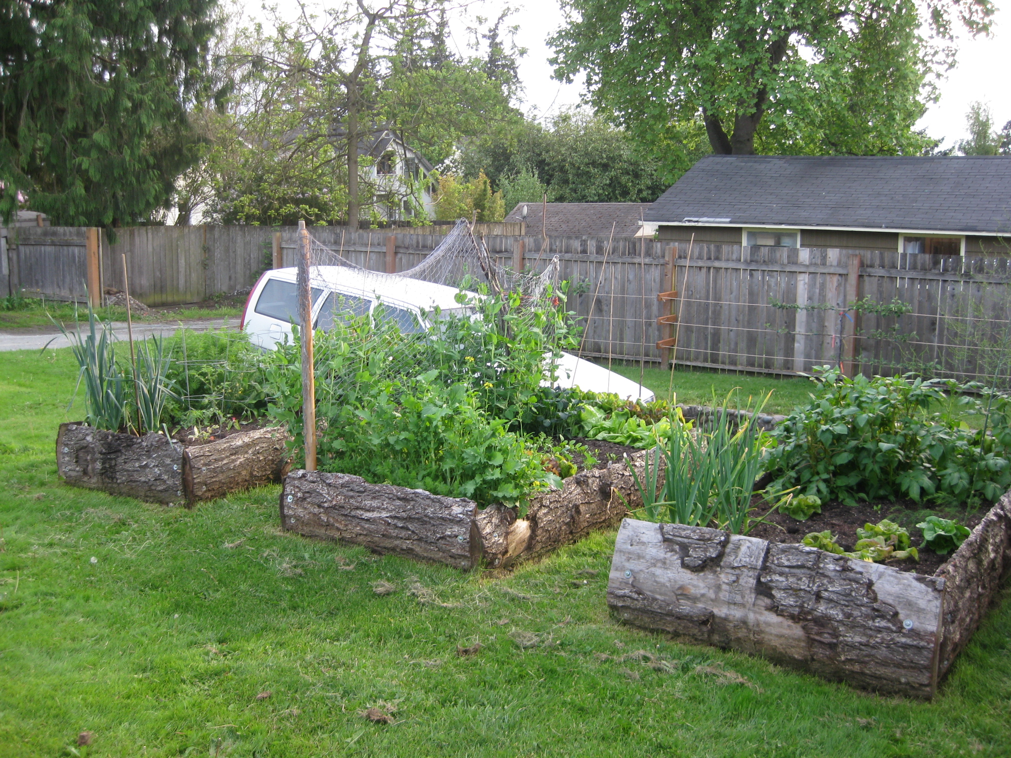 On the far left you’ll see bamboo poles, which I took from another trellis I got for free at a garage sale. The netting was from a Bellingham fishing pier; my friend Karen and I dug until we found nets large enough to carry several pirates. The orange string holding together my architectural masterpiece? Bailing twine from the barn. The large Y wood pieces are branches from a tree my neighbor demolished last year, and yes, ladies and gents, the post on the far right is from a bed frame I found for free on the side of the road. On Orcas Island. In the rain. (See how the Volvo wagons might aid your gardening? Gotta have a wagon to bring home the free loot!)