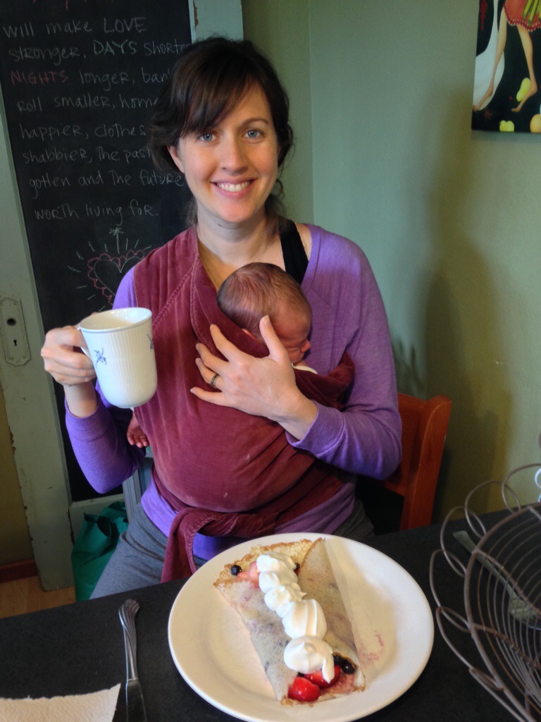 Now, a handful of weeks later, I eat all my meals one-handed, standing, bouncing the babe as I dribble coffee or soba noodle on his head. I dread the day when N demands that LL sleeps in his own bed or crib or hammock because his gassy fits and nursing coos are too loud. I am certain that one day the little munchkin will treat me with the reservation and distance that I witness between my high schoolers and their parents, and I will long for this time when his fat fingers clutched at my neckline and his body squirmed on my lap–blog post be damned.